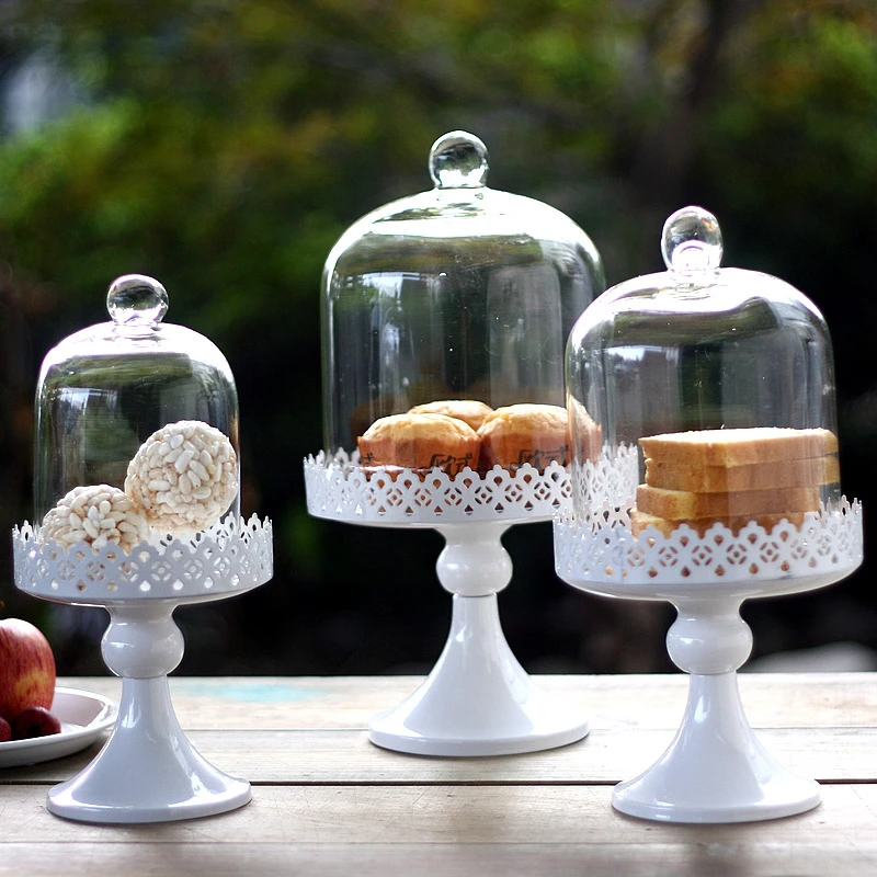 White enameled aluminum cake stand with glass dome transitional dessert and cake stands unique attention to detail made possible to create a beautiful crystal cake stand with dome, on a metal, stable and equally charming base, high gloss.